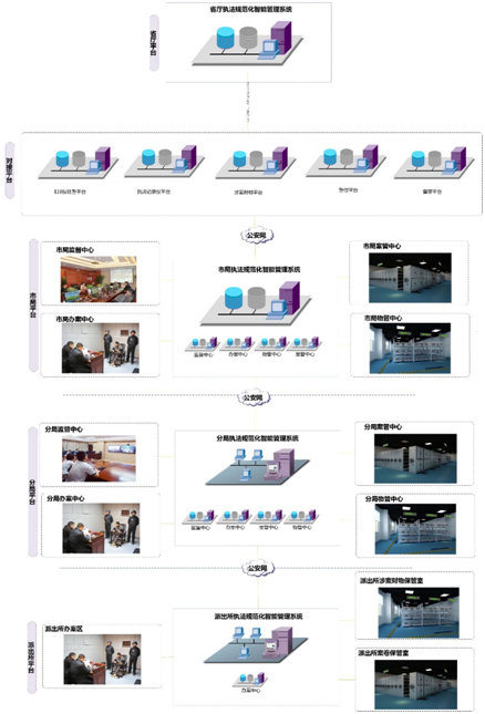 执法规范化智能管理系统包含办案中心、物管中心、案管中心、监督中心,通过四大中心之间数据实时传输交换,对执法办案过程中的“警、案、人、物、卷”进行集约化、标准化、流程化的管理,实现业务流程可视化和全面、实时、可回溯的执法监督管理,形成完整的执法信息化管理链条和监督机制。